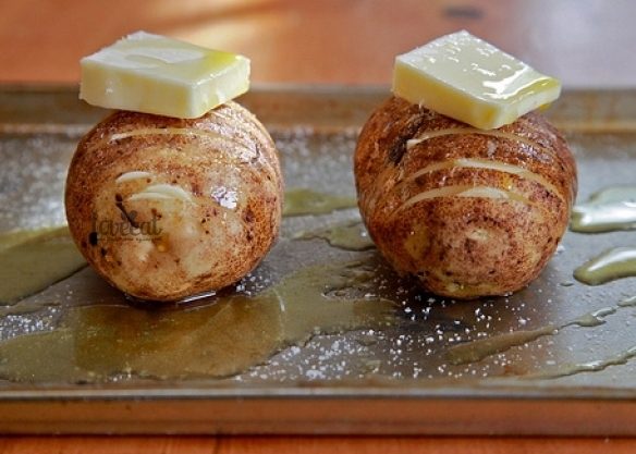 Затем выложите картофель с чесноком на смазанный противень, положите на каждую картофелину по кусочку сливочного масла, посолите и поперчите по вкусу, и полейте сверху оливковым маслом.4