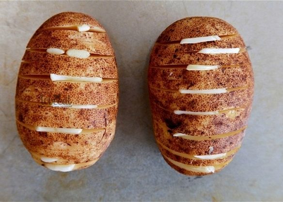 Сделайте на картофеле глубокие надрезы, при этом не разрезая насквозь. Почистите и нарежьте чеснок тонкими ломтиками, и поместите его в надрезы на картофеле.3