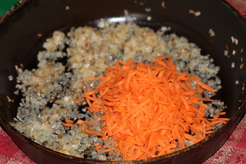 8. Добавить к луку морковь и обжаривать все вместе до мягкости морковки.