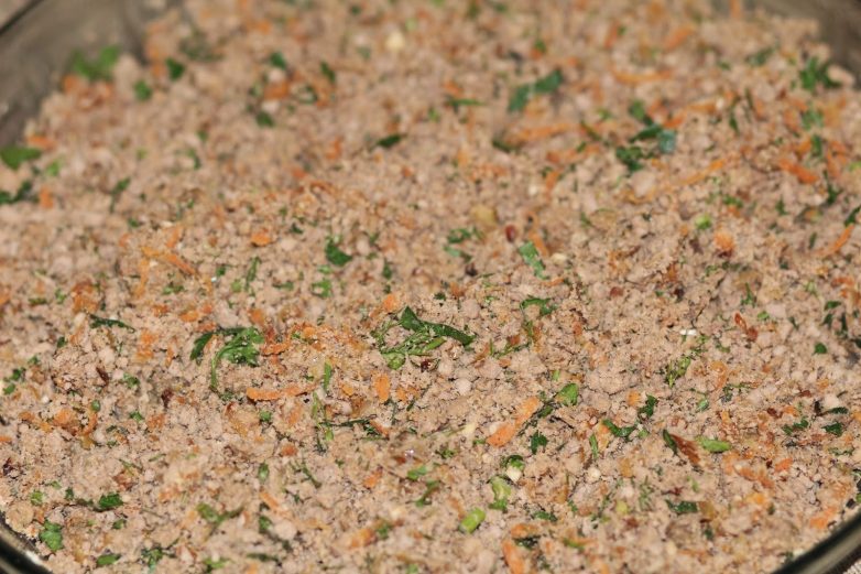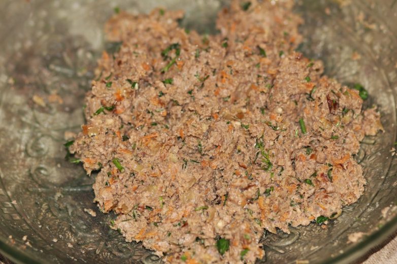 9. В миске перемешать укроп, петрушку, мясо, лук с морковкой, соль и перец.