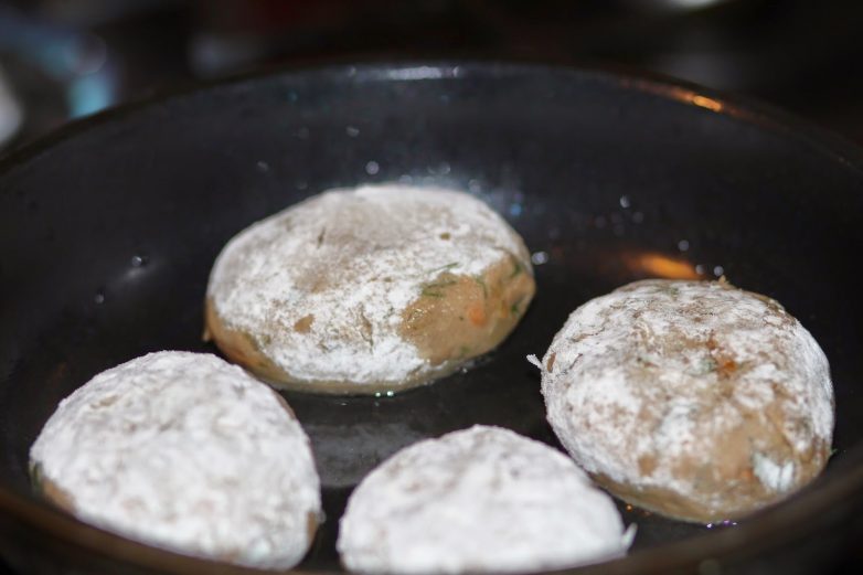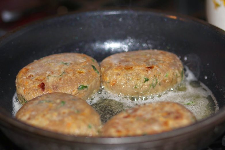 12. Разогреть в сковородке растительное масло и обжарить котлетки на среднем огне по 2 минуты с каждой стороны до золотистой корочки.