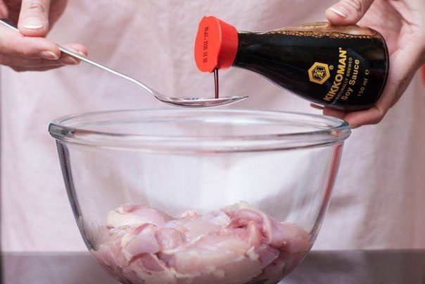 Куриное филе режем на небольшие кусочки, кладем в миску, вливаем туда соевый соус.