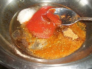 В сковороду кладем томатный соус, вливаем уксус, растительное масло, добавляем приправу для моркови по-корейски, красный и черный молотые перцы, соль м немного воды. Доводим до кипения и хорошо размешиваем.