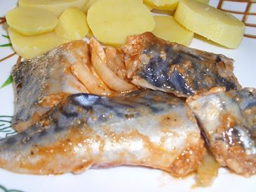 Маринованная скумбрия в острой заливке готова. Подаем ее с картошечкой, с пюре, можно картошечку запечь или просто жарим ее.