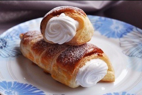 Со щепоткой лимонной кислоты взбить отделенные от желтков белки до состояния крепкой пены. На максимальной скорости миксера влить в белки получившийся сироп и взбивать массу, пока она не остынет. Получившимся кремом наполнить кондитерский мешок и аккуратно заполнить им все испеченные трубочки. Трубочки из готового слоеного теста с кремом украсить сахарной пудрой и выложить на сервировочное блюдо.