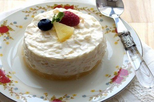 Блюдо рисовый пудинг с ананасом и сливками готовится из круглых сортов риса, подавать с фруктами и сладким соусом.