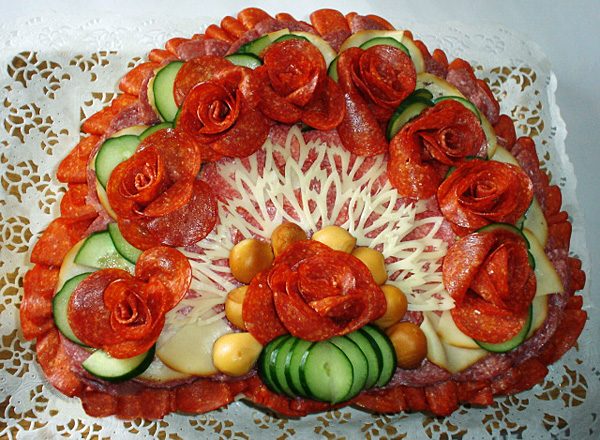 Мясная нарезка, как и красивая фруктовая тарелка, может быть оформлена живыми цветами.