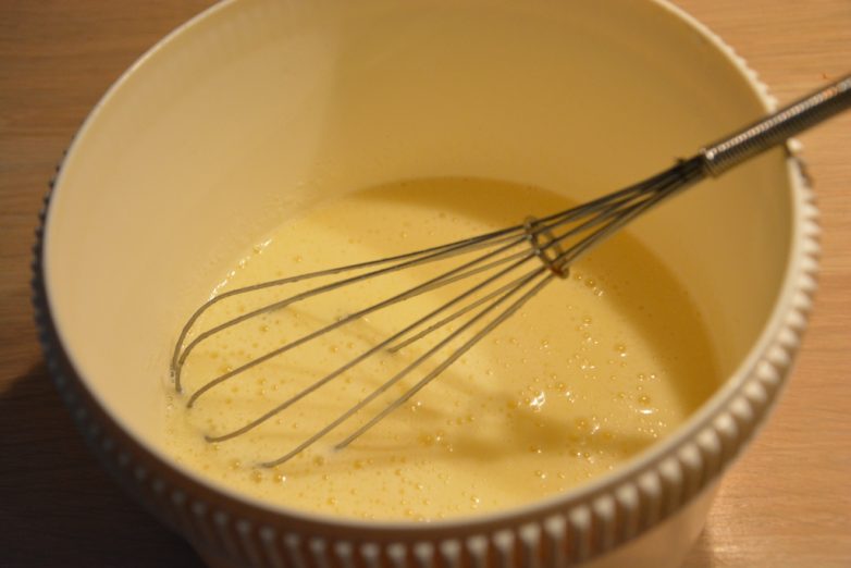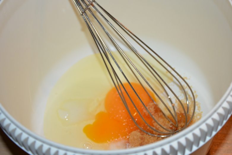 1. Яйцо взбить с сахаром и солью ручным венчиком или вилкой.