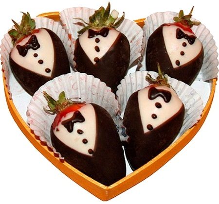 Клубника покрывается белым шоколадом, а затем кисточкой расписывается черным шоколадом и из корнетика украшается сахарной помадой, глазурью.