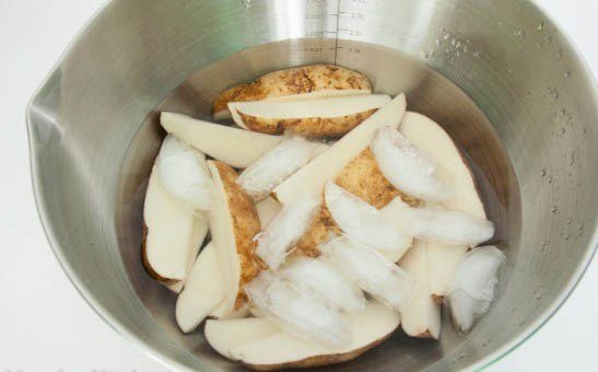 Положите картофель в миску с водой и добавьте 2 чашки кубиков льда. Оставьте на 30 мин, затем высушите бумажными полотенцами.
