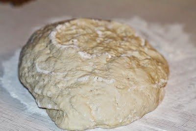Стол подпылить мукой (50 гр.). Выложить тесто на стол и хорошо его вымесить. Если после этого тесто все еще будет слегка липнуть к рукам, то смазать руки растительным маслом и продолжать вымешивать.