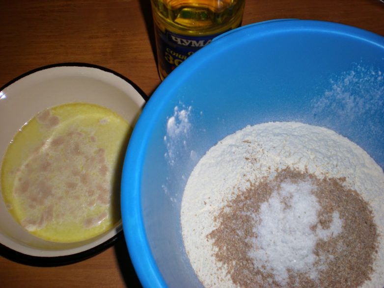 Муку просеять, добавить в нее отруби, соль. Смешать. Когда у опары поднимется «шапочка», влить ее в мучную смесь, добавить растительное масло и замесить тесто.