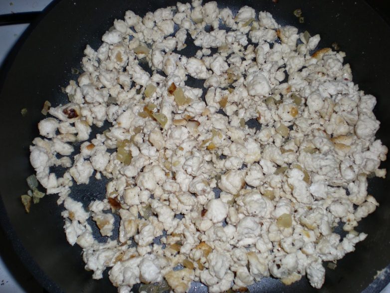 Для начинки луковицу нарезать кубиками, пассеровать в небольшом количестве растительного масла, добавить фарш. Жарить на среднем огне несколько минут, хорошо размешивая, чтобы не было мясных комочков. Посолить по вкусу. Снять с огня, остудить.