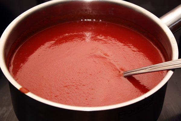В разрезанные пополам помидоры влить 120 мл воды и потушить. Протереть соус через дуршлаг, процедить вместе с образовавшимся во время тушения соком, перелить в чистую кастрюлю и варить до загустения. За 10 минут до готовности добавить толченные грецкие орехи, чеснок, стручковый перец, кориандр и соль.