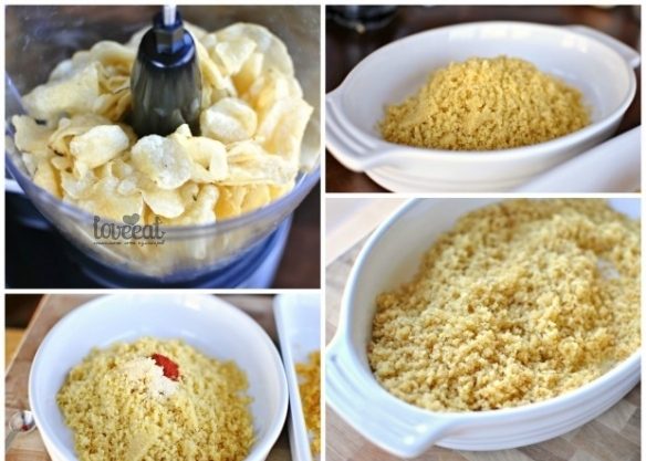 Теперь приготовим два варианта панировки. В одной посуде измельчите не очень острые чипсы. Добавьте чесночный и луковый порошки и паприку. Перемешайте.