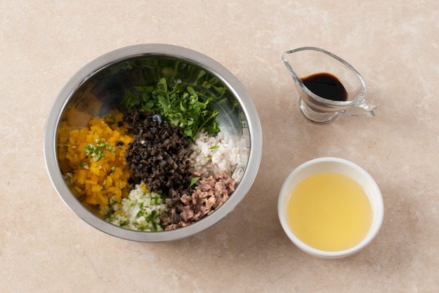 Раздавите маслины, удалите косточку и мелко нарубите мякоть.