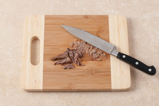Мелко нарубите анчоусы и разотрите их в пасту плоскостью ножа.
