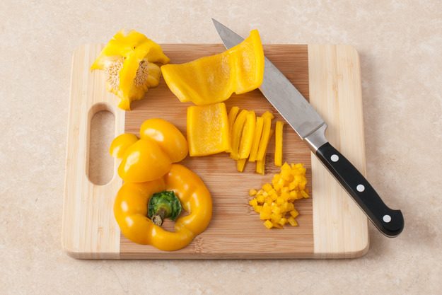 Срежьте шляпку и донышко болгарского перца, разрежьте его на 4 части, срежьте семена с перегородками, нарубите его мелкими кубиками.