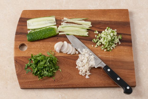 Огурец и лук шалот нарежьте мелкими кубиками, зелень мелко порубите.
