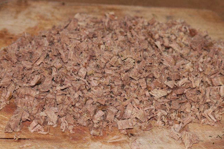 Отварное мясо нарезать мелким кубиком.