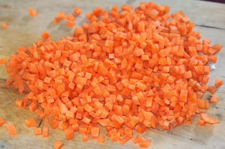 Морковку (150 гр.) нарезать кубиком, примерно 0.5 см.