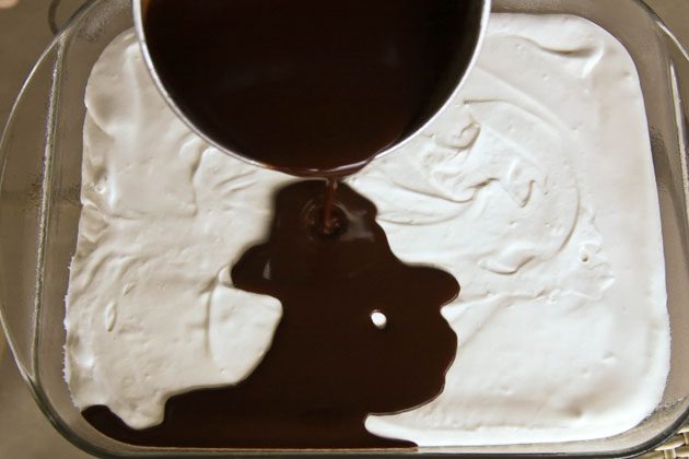 Получившуюся шоколадную смесь охлаждаем до комнатной температуры, а затем равномерно распределяем по слегка застывшей белой массе в нашей стеклянной форме.