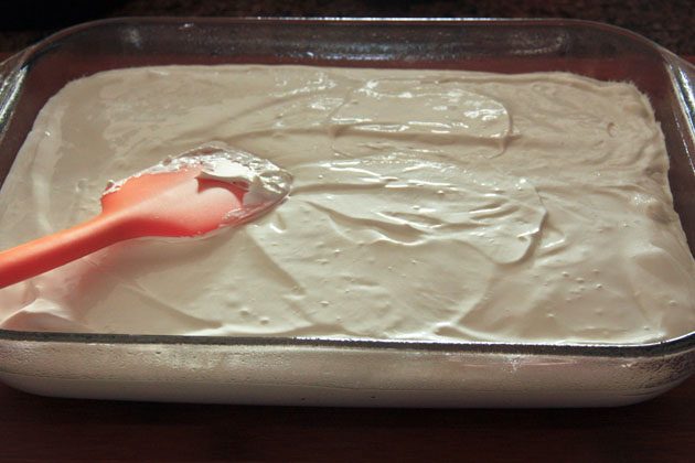 Если у вас получилась идеальная масса, то она равномерно распределится по поверхности, и пирожное получится красивым.