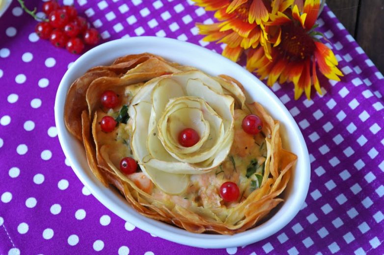 Сверху выложить оставшийся картофель в виде розочки. Смазать кисточкой растительным маслом верхний картофель.Отправить в духовку при 180* на 20 минут.Подавать в теплом виде.