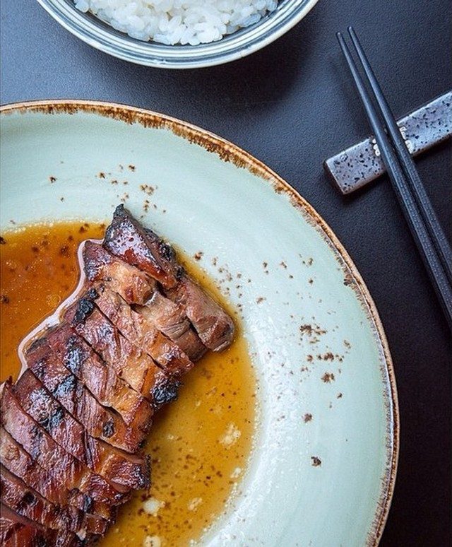 Это свинина, обжаренная в меде, только не простая, а от особых японских свиней. Обязательно попросите хорошенько прожарить мясо.