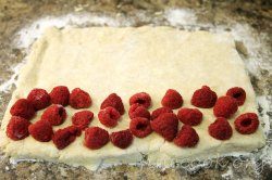 — Начиная 'сверху' (ягоды – низ), сложить тесто, завернув верхнюю треть, и потом завернуть тесто на слой с малиной. Слегка прижимать каждый слой.