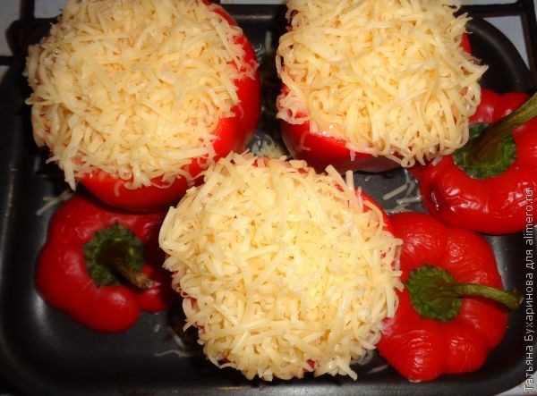 Закрыла перцы срезанными ранее крышечками и поставила в духовой шкаф (разогретый до 200 градусов) на 25 минут.