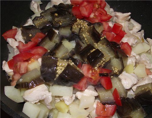 Когда картошка станет размягчаться, это минут через 7-8, бросаем порезанный замороженный баклажан и свежий помидор. И буквально 1 минутку тушим.