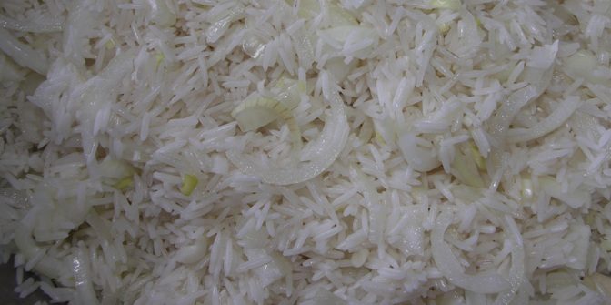 Рис замачивался часа два. Затем воду слили и смешали с луком. Вон, как наверху.