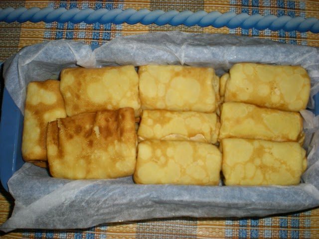 Начинкой тонко смазать блинчик. Можно просто скрутить его трубочкой и уложить спиралью в круглую форму. Но мне нужно было этот пирог перевозить, поэтому я свернула блины немного по другому и выкладывала блинчики в прямоугольную форму размером 10 х 24 см.