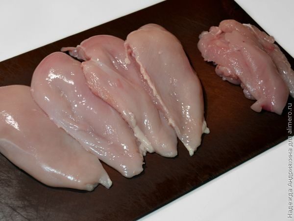 Разделываем куриные грудки: снимаем кожицу и жир, удаляем кости. Каждую грудку разрезаем пополам. После отделения кости на каждой половинке будет большое и малое филе, не очень прочно соединенное с основной частью.