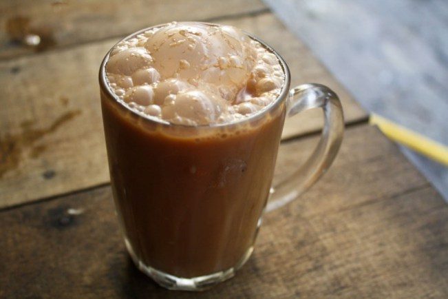 Традиционный тайландский чай подаётся с охлаждённым сгущённым молоком и льдом.