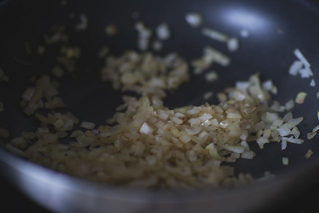 Мелко нарезанный лук обжариваем в растительном масле 5 минут.