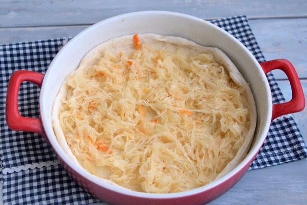 Выложите корж в форму, обработанную кулинарным жиром, покройте его капустной начинкой, распределите ее по всему периметру.
