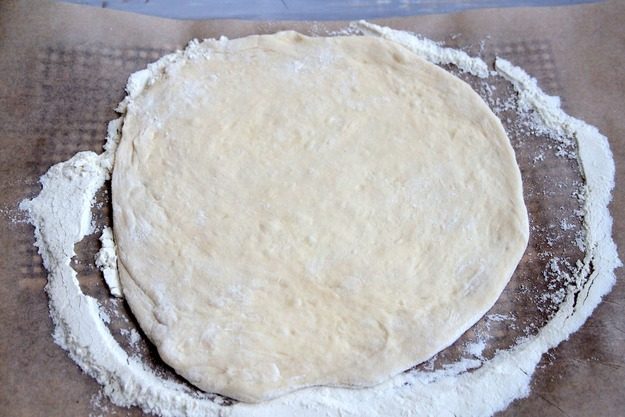 На присыпанном мукой столе разомните руками и разделите на 2 равные части заранее заготовленное тесто. Каждую часть теста раскатайте с помощью скалки, и придайте ему форму круга, диаметром немного больше, чем огнеупорная форма.