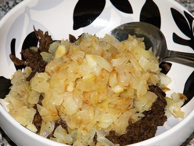 На этот процесс уйдет примерно 5 – 7 минут в зависимости от раскаленности масла. Обжаренный лук перекладываем в миску к измельченным грибам.