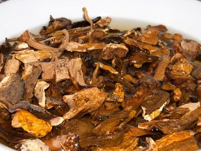 Первичная подготовка сушеных грибов имеет большое значение, во время сушки они проветриваются и покрываются тонким слоем пыли. Поэтому в первую очередь скидываем их в дуршлаг с крупной сеткой и тщательно промываем под струей холодной проточной водой от любого рода загрязнений, уделяем этому процессу добрых 7 – 10 минут. После перекладываем их в глубокую миску и заливаем 2 литрамичистой воды. Настаиваем грибы в жидкости 12 часов лучше делать это на ночь.