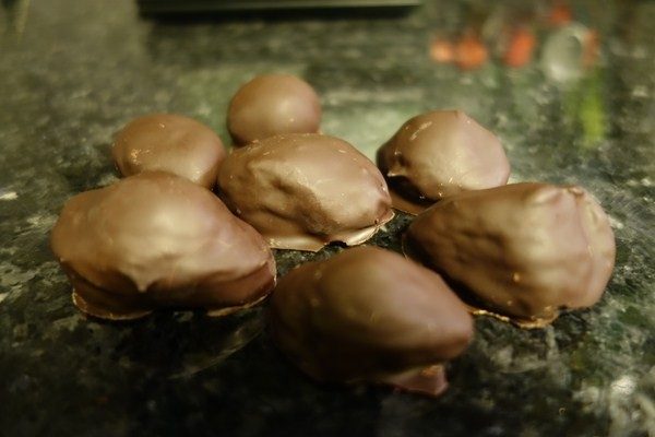 Решено было затолкать внутрь ганаш, ну… например с абрикосовыми косточками.