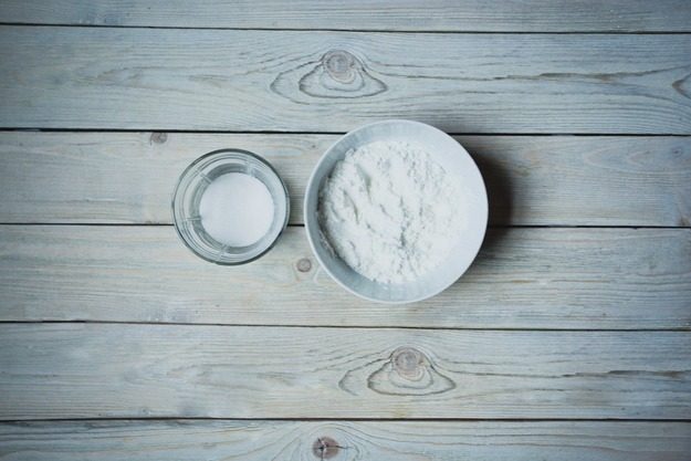 Для начала необходимо смешать между собой все сухие ингредиенты в одной миске: кукурузную муку, соль и сахар.