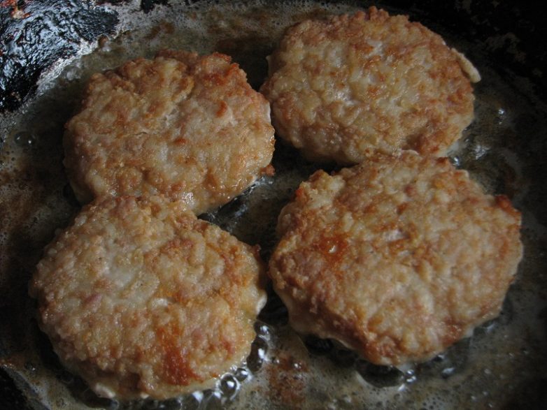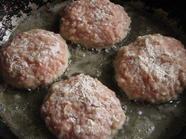 Скатать из фарша шарики диаметром около 4-5 см. немного приплюснуть, обвалять в муке.