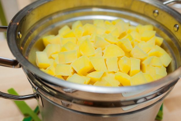 Очистить картофель, помыть и нарезать на кубики 2х2 сантиметра. Сварить до готовности в соленой воде, слить воду.