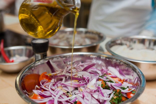 Смешать в глубокой миске лук, черри и петрушку с лимонным соком, оливковым маслом, солью и перцем.