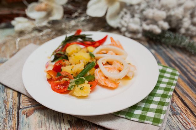 Невероятно популярны стали также теплые салаты из морепродуктов (мидий, креветок, кальмаров), которые удачно сочетаются с рисом, картофелем, помидорами.