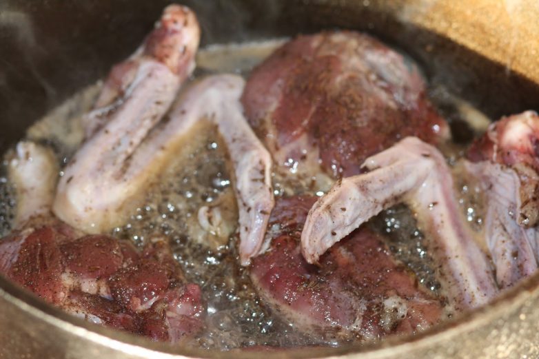 7. Выложить уточку кожей вниз и обжарить до золотистого цвета.