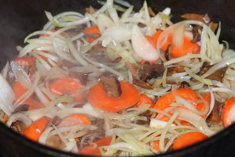 14. Часть жира от обжаривания уточки слить (оставить примерно 4 — 5 ст. л.). Выложить в казан лук, морковь, грибы и обжаривать все вместе до золотистого цвета.
