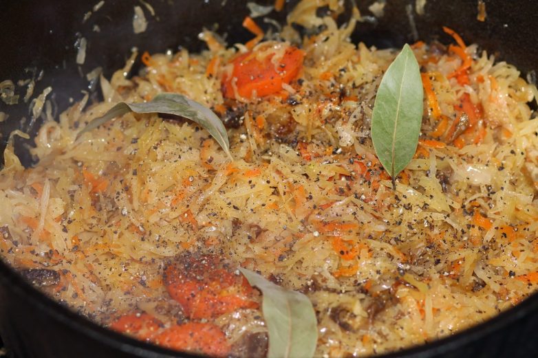 18. Капусту посыпать толченым перцем, положить лавровый лист. Залить капусту грибной водой так, чтобы жидкость только слегка покрывала овощи с квашеной капустой.(примерно 750 мл.)
